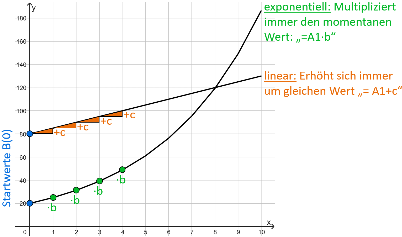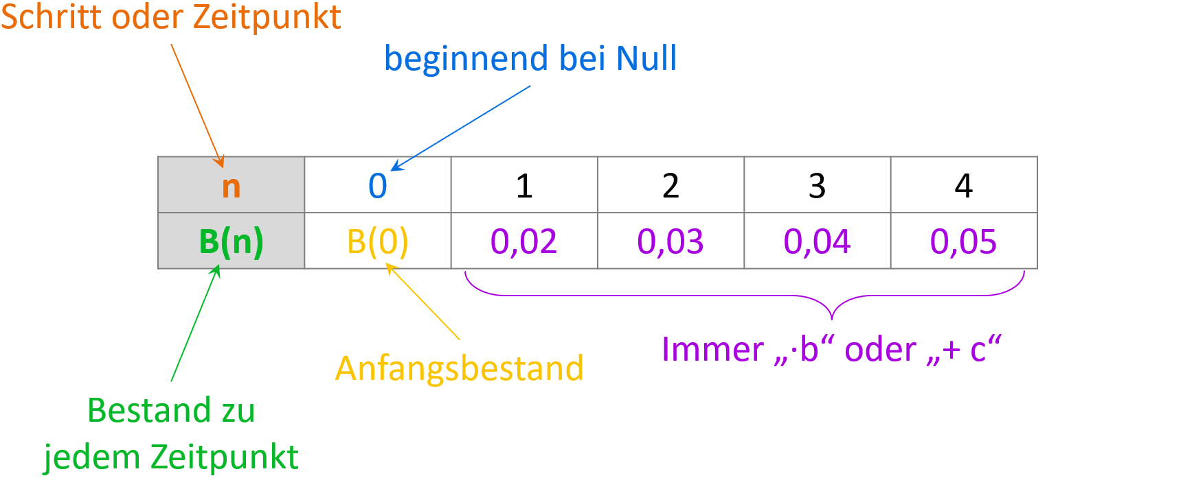 Die Bestände von exp. und lin. Wachstum können schrittweise mit folgenden Funktionen berechnet werden: