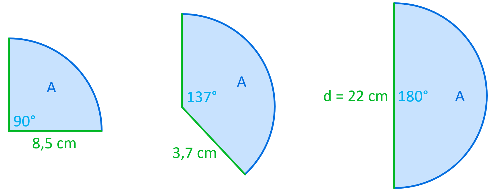 Berechne die Flächeninhalte der drei dargestellten Kreissegmente.