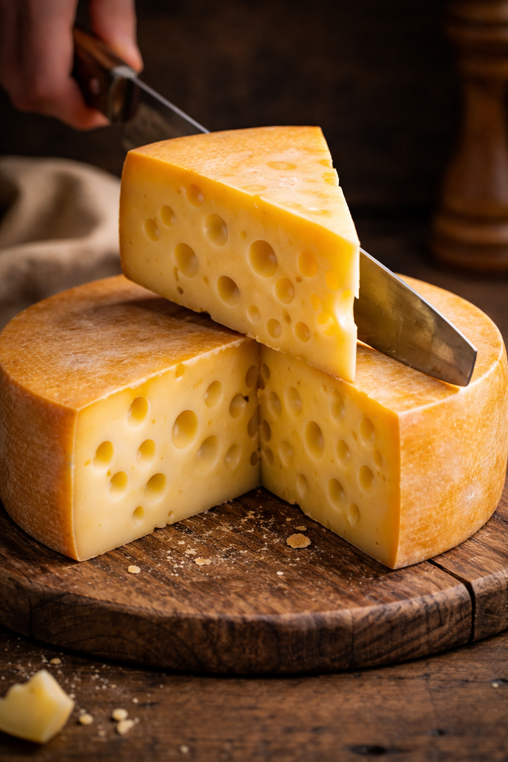 Berechne das Volumen des Käsestücks (Löcher im Käse können ignoriert werden), wenn der Schnittwinkel 38° beträgt und der Käselaib 8 cm hoch und insgesamt 23 cm breit ist.
