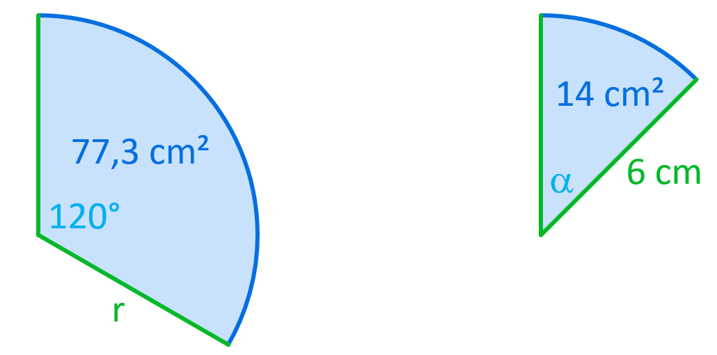 a) Ermittle den Radius r eines Kreissegments, der einen Flächeninhalt von 77,3 cm2 und einen Winkel von 120° besitzt (Abb. links).